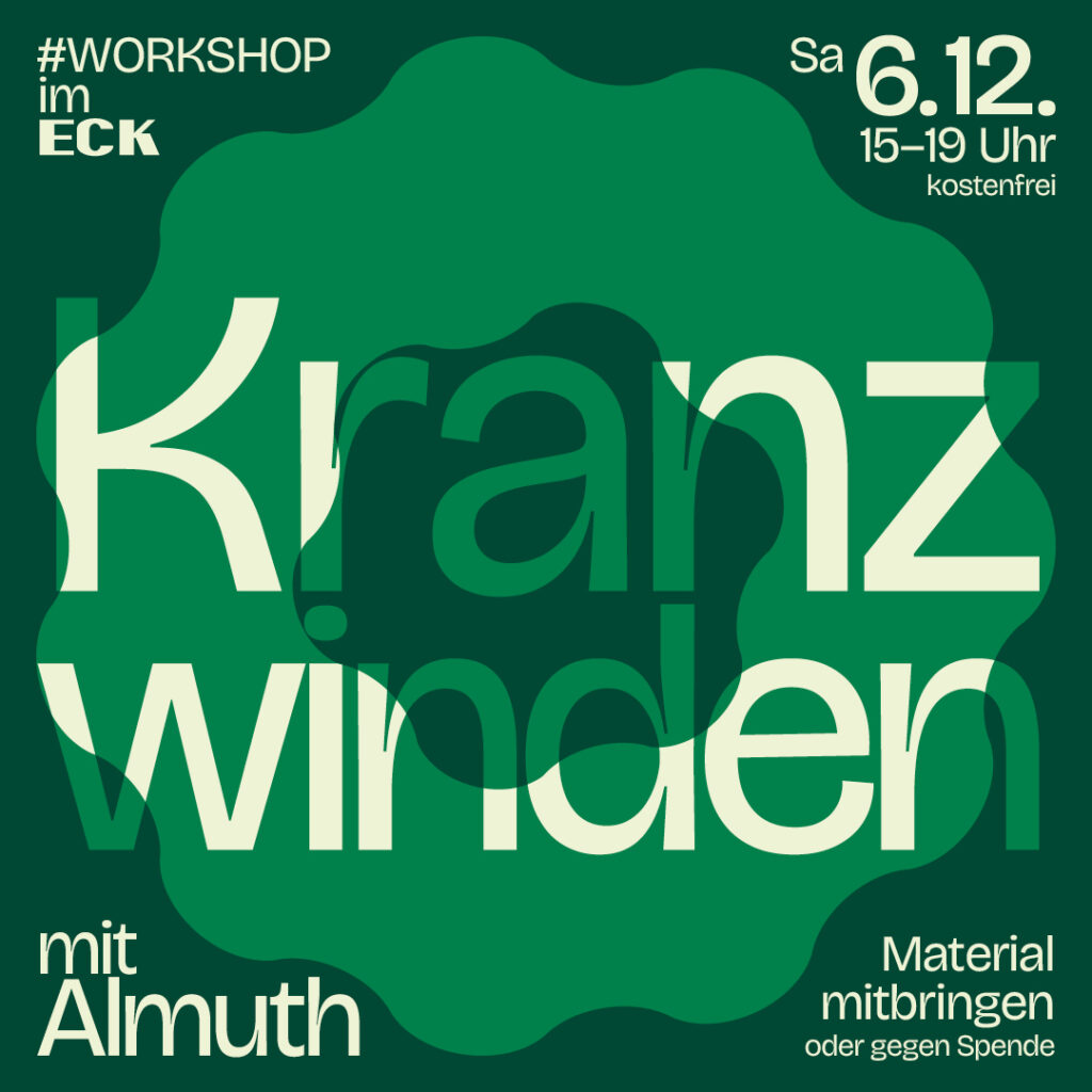 Kommt vorbei zum Winterkränze winden mit Almuth im ECK! Im gemütlichen Floristik-Workshop stimmen wir uns auf Weihnachten ein und winden mit Naturmaterialien handwerlich Kränze. Diesen Sanstag 15-19 Uhr, wie jedes Jahr gibt es auch Glühwein und Räucherei, we hat kann gern etwassüßes mitbringen! Die Teilnahme ist kostenlos, Materialien gerne mitbringen oder vor Ort gegen Spende/Einkaufspreis. Wir freuen uns!